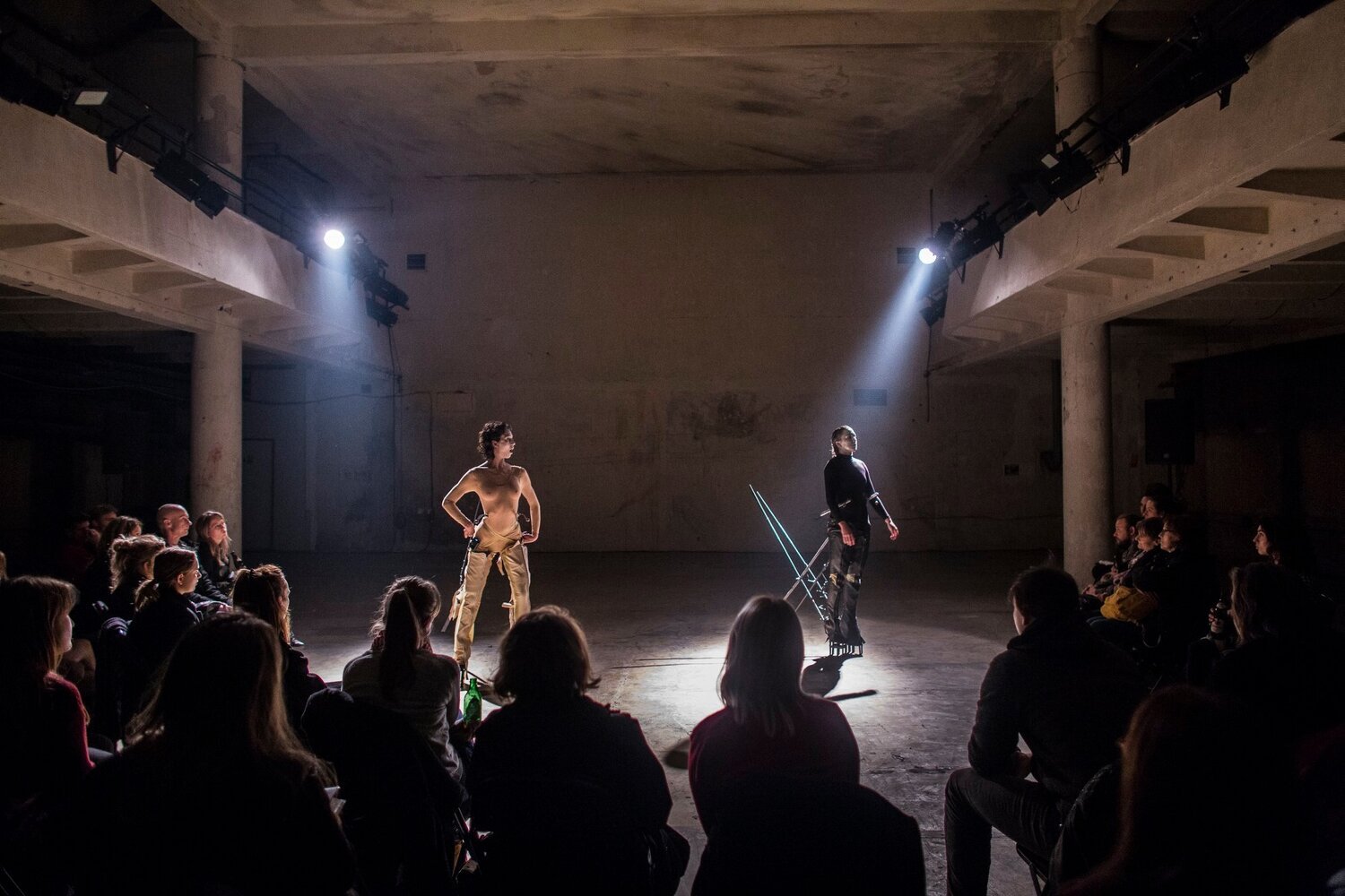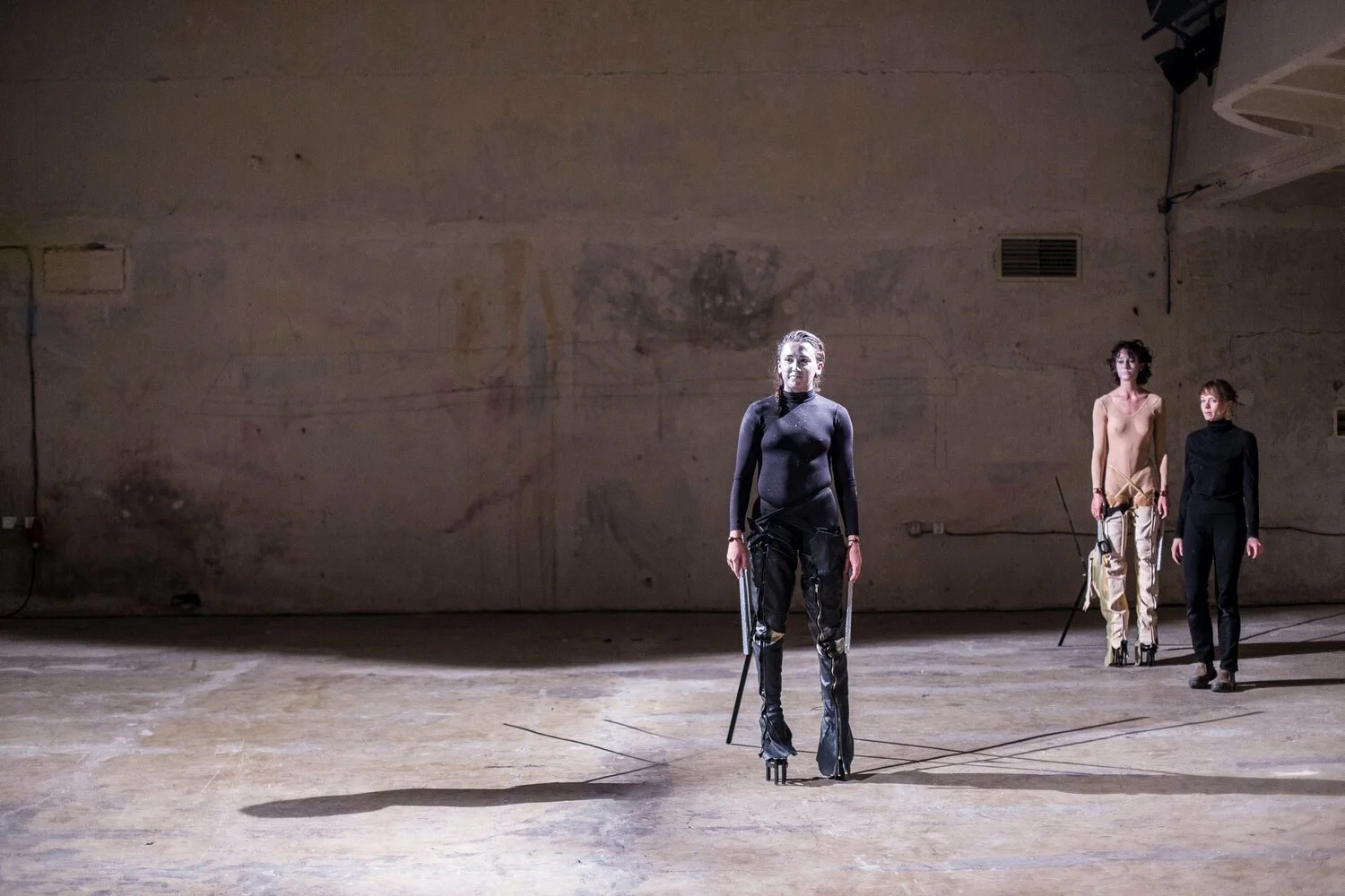 Polite Structures is a performance series which incorporates movement, sculpture, and sound to create an immersive, uneasy, sexually charged atmosphere. The female performers are hobbled by exaggerated, sculptural leg braces which I cast, welded and shaped in aluminum and steel. These contraptions are both provocative and uncomfortable to move in. Each time a dancer tries to take a step forward the braces drag her feet to the floor -- such that progress can be made only through labored half-steps. Their calves are elongated, the line of their upper thighs extended, and their movements become muscular even as their feminine forms are emphasized. These tensions, both physical and aesthetic, result in a movement-score that is full of physical intensity and disturbing visual beauty.