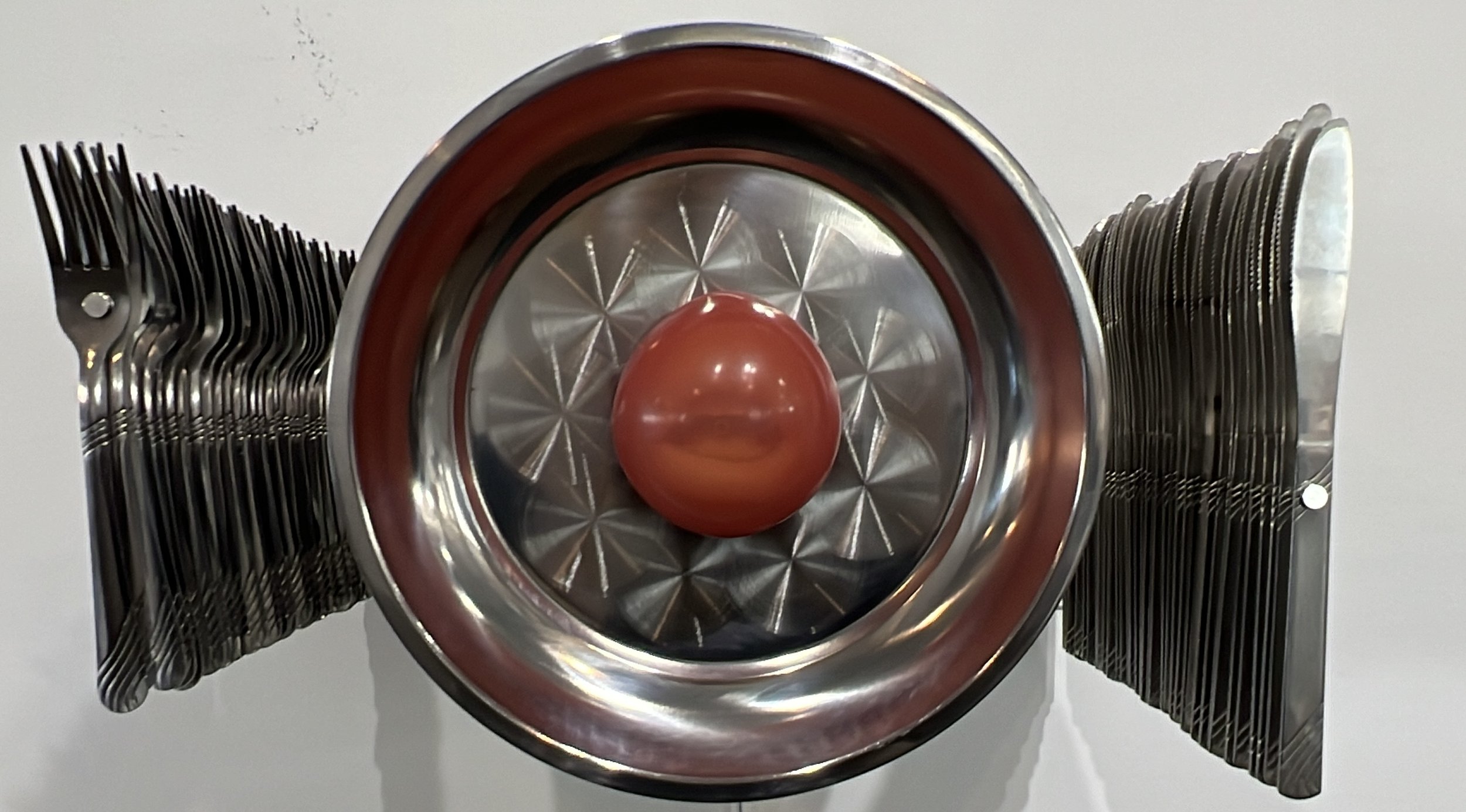 A Cultivated Atmosphere/ A Narrowing Corridor is a collaborative work with Zelda Smith. The work consisted of a silicone mouth adhered to the center of a stack of 30 brushed aluminum plates. The mouth was covered by a translucent silicone bubble. On each side of the plates, a set of stacked utensils (forks on the left, knives on the right), were mounted in a manner resembling a floating, extruded place setting. A concealed pump draws air out of the silicone bubble which encompasses the mouth-form, collapsing the bubble and drawing it against the shape of the mouth. Air was then slowly pumped back into the bubble so that it inflated and expanded back to its original form. This cycle of inflation and deflation corresponds to a cycle of revelation/concealment. The choreography of mechanical breath imbues the work with a sense of anxiety and claustrophobia. The sculpture speaks to the passive and sterile consumerism pervasive in our daily lives. Many lack necessities to support the indulgent excess of the few. The work models mechanistic cycles of human need vs desire and how those two things are at odds with each other, contributing to the ever-growing wealth gap. The incorporation of soft robotic techniques and the ability to mimic breath in our sculptures has allowed us to explore “affective” design. With A Cultivated Atmosphere/ A Narrow Corridor, we explored the possibilities of making a sculpture that demonstrates an embodied experience, as well as one that elicits an embodied reaction from the viewer.
